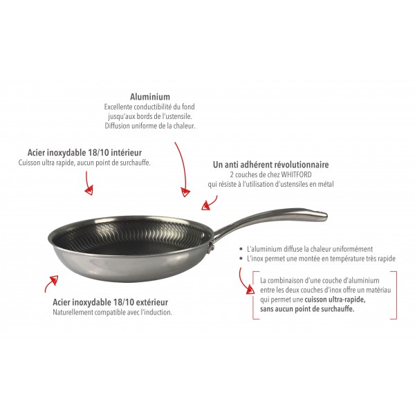 La combinaison d’une couche d’aluminium entre les deux couches d’inox offre une cuisson plus rapide et plus homogène.